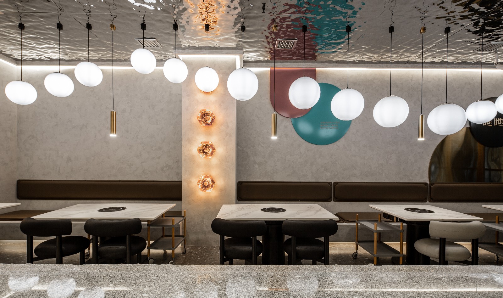 美麗的吊頂還需要燈光的映襯,方能展現(xiàn)完美,因此挑選合適的燈飾就非常有必要了,很多人喜歡用吊燈來映火鍋店的氣氛。