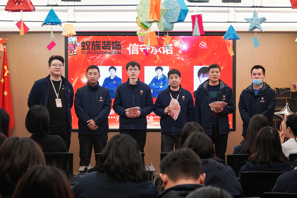 2022年2月16日河南蟻?zhàn)逖b飾工程有限公司員工在鄭州總部舉行開工儀式。