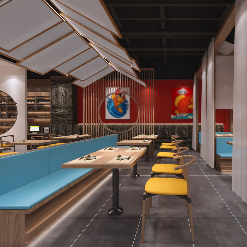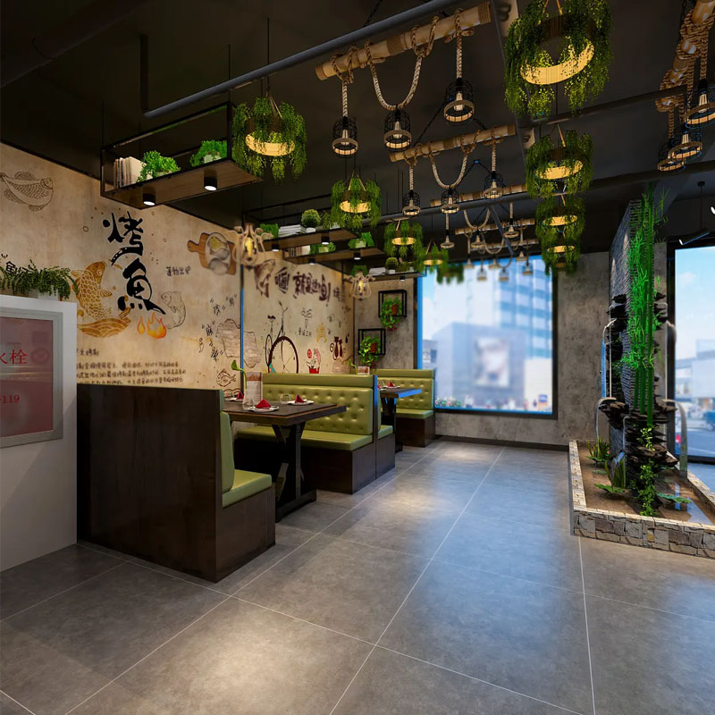 由于烤魚油煙重,長期經(jīng)營,墻面、地面容易形成難以清洗的油跡,因此店內(nèi)應采用防滑地磚,種類齊全、花色繁多,施工也比較簡便,最好選用深黃色系的仿古墻磚或者是耐磨耐臟的水磨石。背景墻可以根據(jù)時尚的潮流設計,可以貼上炫酷的圖紙或者烤魚的來歷,可以吸引到進店的客人。