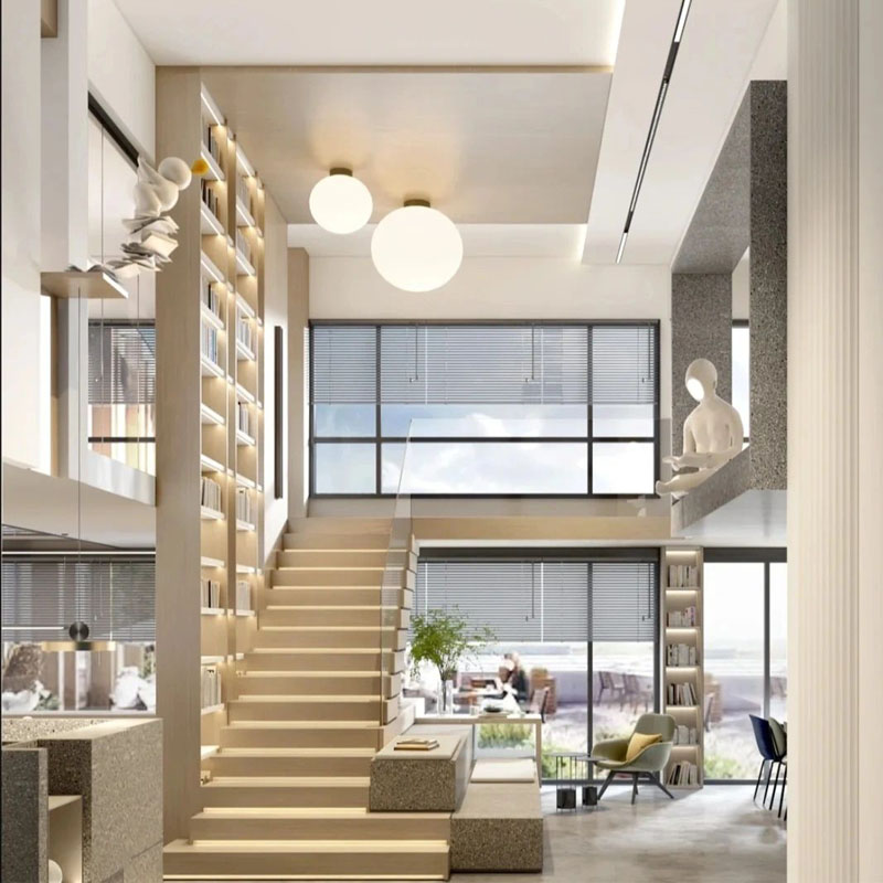 外觀上,復(fù)式辦公室可以將每個(gè)空間相結(jié)合,添加一些溫馨特點(diǎn)的設(shè)計(jì),多出來的區(qū)域可以加一個(gè)小的辦公室,或者設(shè)計(jì)成休閑區(qū)或者洽談接待室,都是不錯(cuò)的選擇。樓梯可以使用鐵踏板和鐵欄桿,可以展示復(fù)式辦公室的獨(dú)特設(shè)計(jì),成為整個(gè)辦公室最美麗的風(fēng)景。