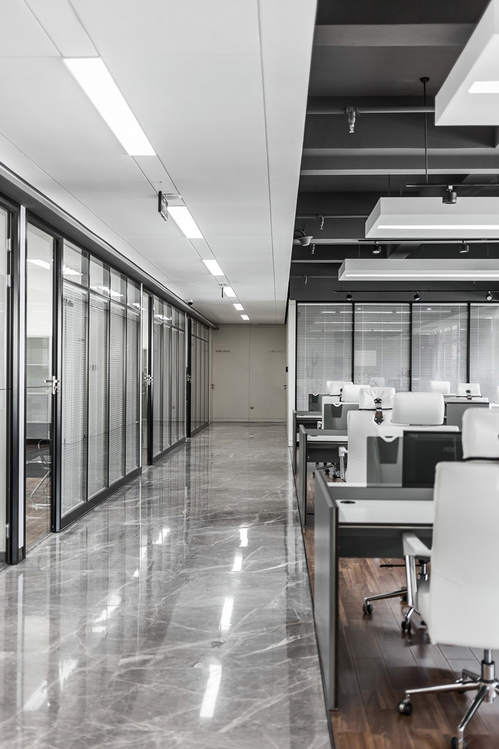 設計獨特之處在于很好融合了時尚科技、中式文化、自然生態(tài)這幾個看似并無關(guān)聯(lián)的設計理念??臻g選用現(xiàn)代水墨灰白以及深木色調(diào)貫穿整個空間,其間以不同色彩比例配比,各異的材質(zhì)組合來詮釋設計意圖。空間動線嚴謹、簡化,能在使用中提高效率,使團隊之間便于溝通。