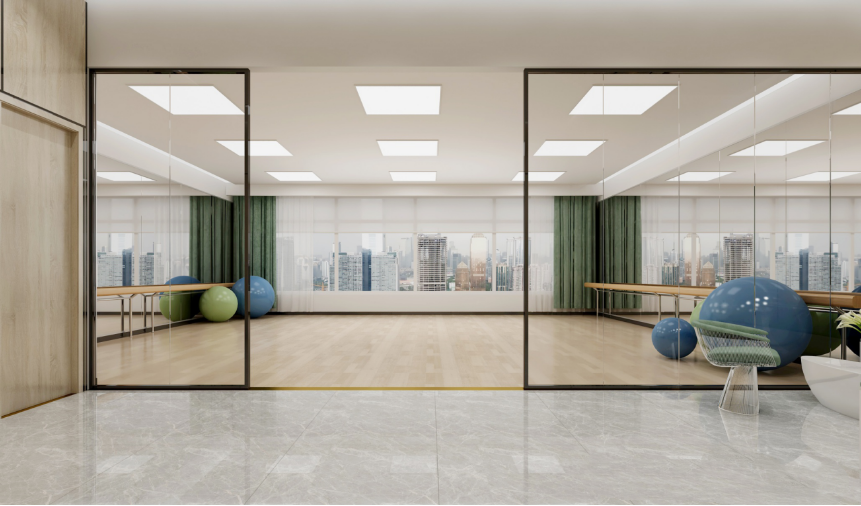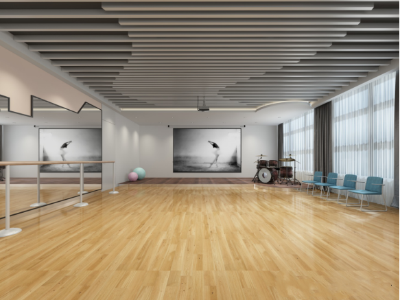 主要用材:石膏板、鋁方通、舞蹈地板、木地板、防火板、乳膠漆